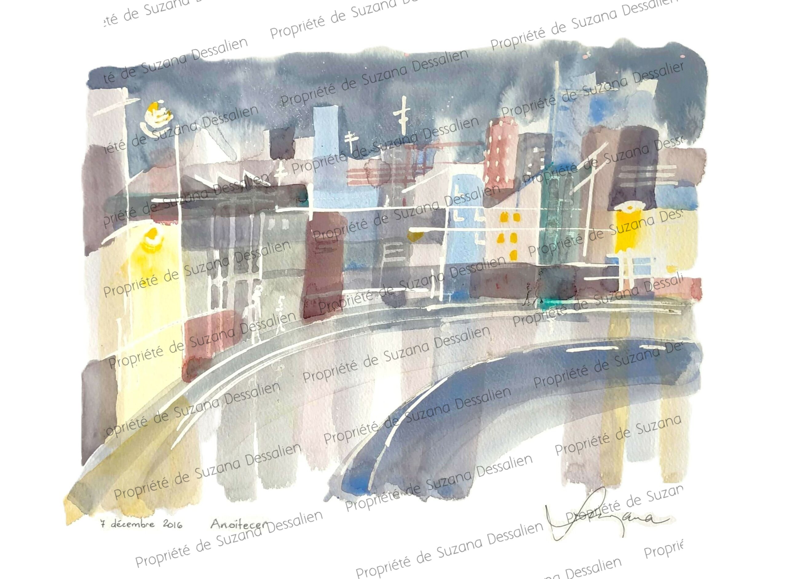 La ville imaginaire s’endort dans cette aquarelle crépusculaire où les dernières lueurs du jour caressent l’architecture urbaine de nuances dorées et violettes. Ce paysage onirique révèle la poésie secrète des fins de journée en milieu urbain, quand les lumières artificielles commencent leur ballet nocturne. L’artiste a su capturer cette heure magique où réalité et rêve se confondent, transformant la géométrie urbaine en composition colorée. Chaque reflet aquarellé évoque la mélancolie douce de ces instants suspendus entre jour et nuit, quand la ville révèle son âme la plus tendre.